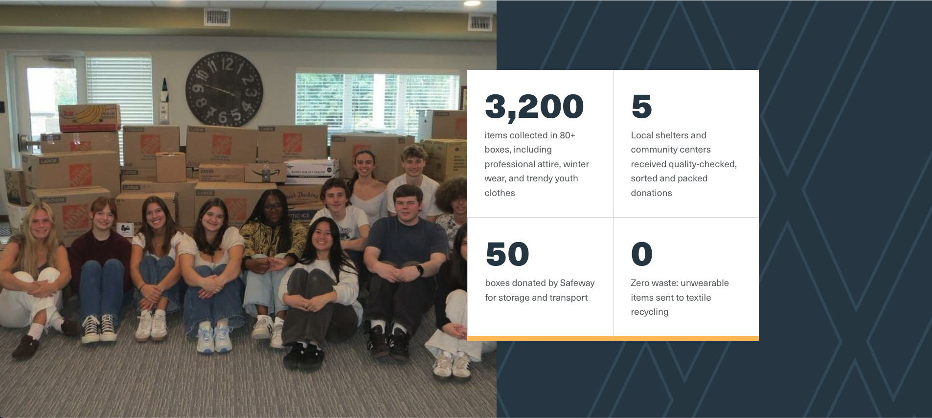 I visited my cousin, who was staying at a Seattle women’s shelter, and I got to talk with her and her friends, and one thing she talked about was clothing. She had a job interview coming up, and her shelter didn’t have any professional attire. I went home, grabbed my DECA business clothes, and brought them back for her. That was the start. Then I realized, okay, that’s just one interview outfit—how can I help more? So we hosted a neighborhood clothing drive. After talking with the shelter staff, they told us that while they appreciated general donations, what they really needed were specific items. That launched us into fundraising for socks and underwear (which they can’t take used) and hosting specialty targeted drives.